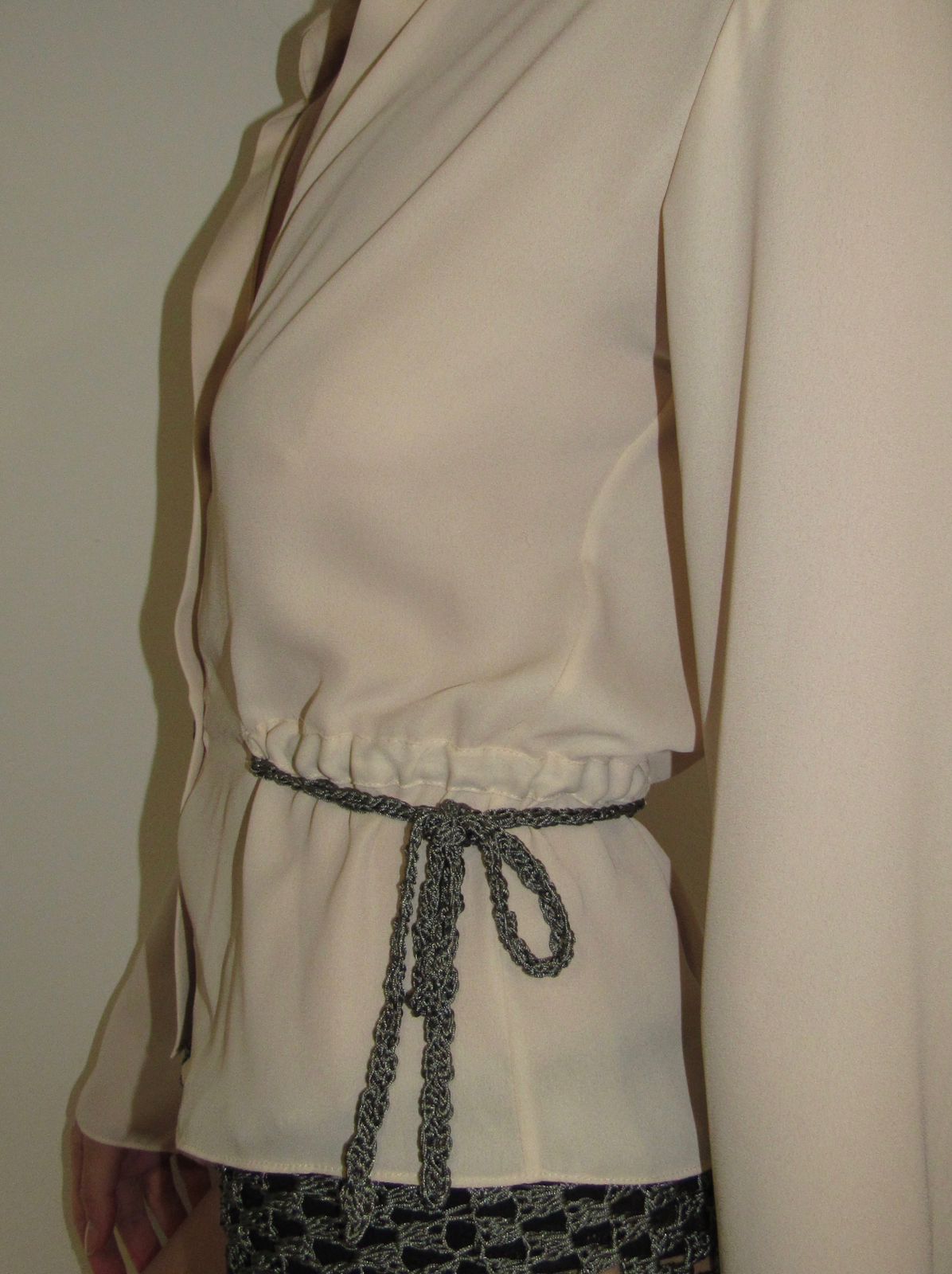 Camisa social com botões metálico em formato de rosa. Rolotê de crochê grafite acinturando a camisa nas laterais