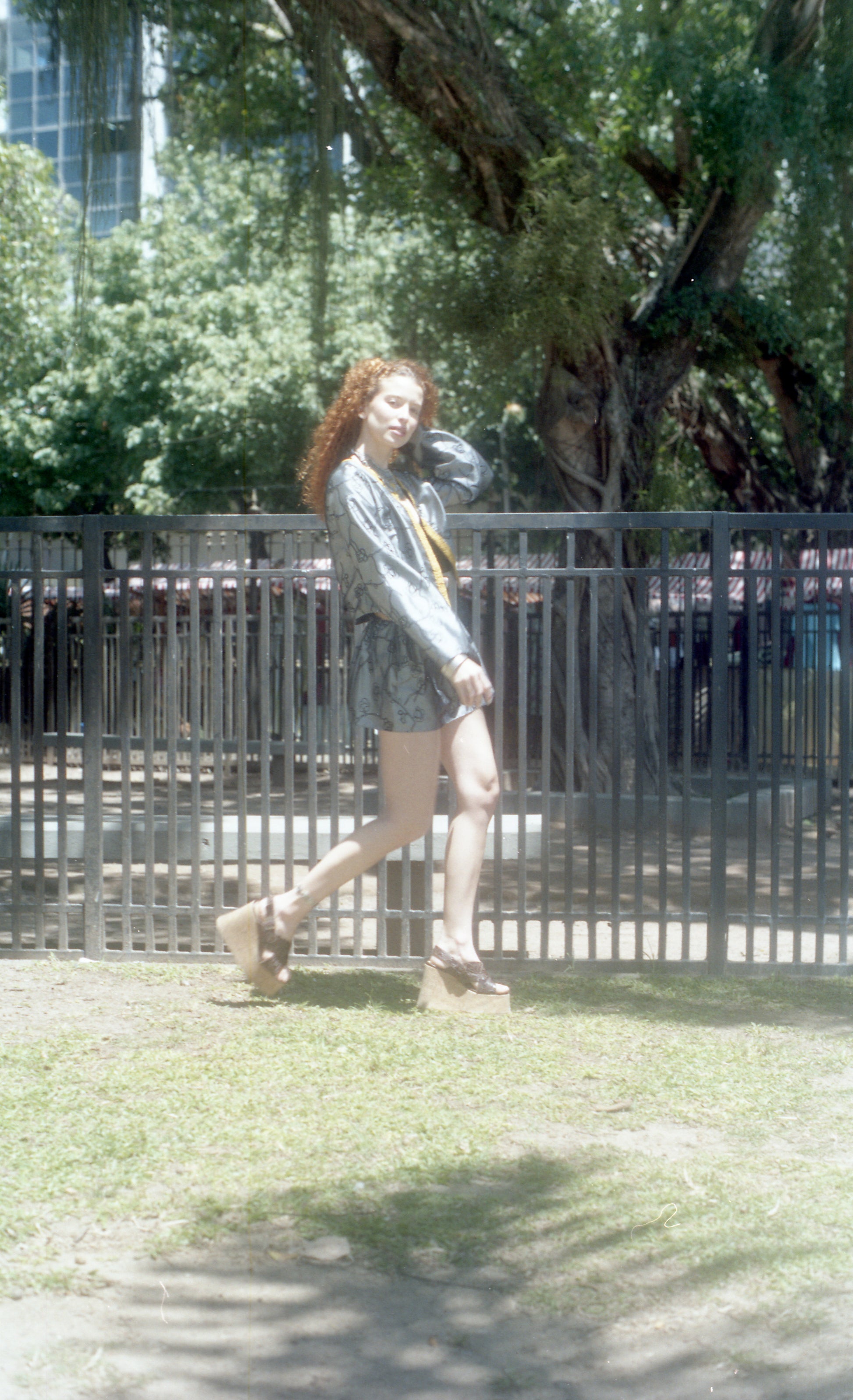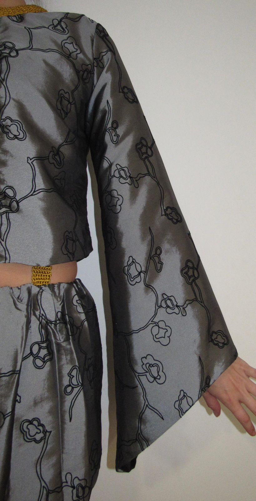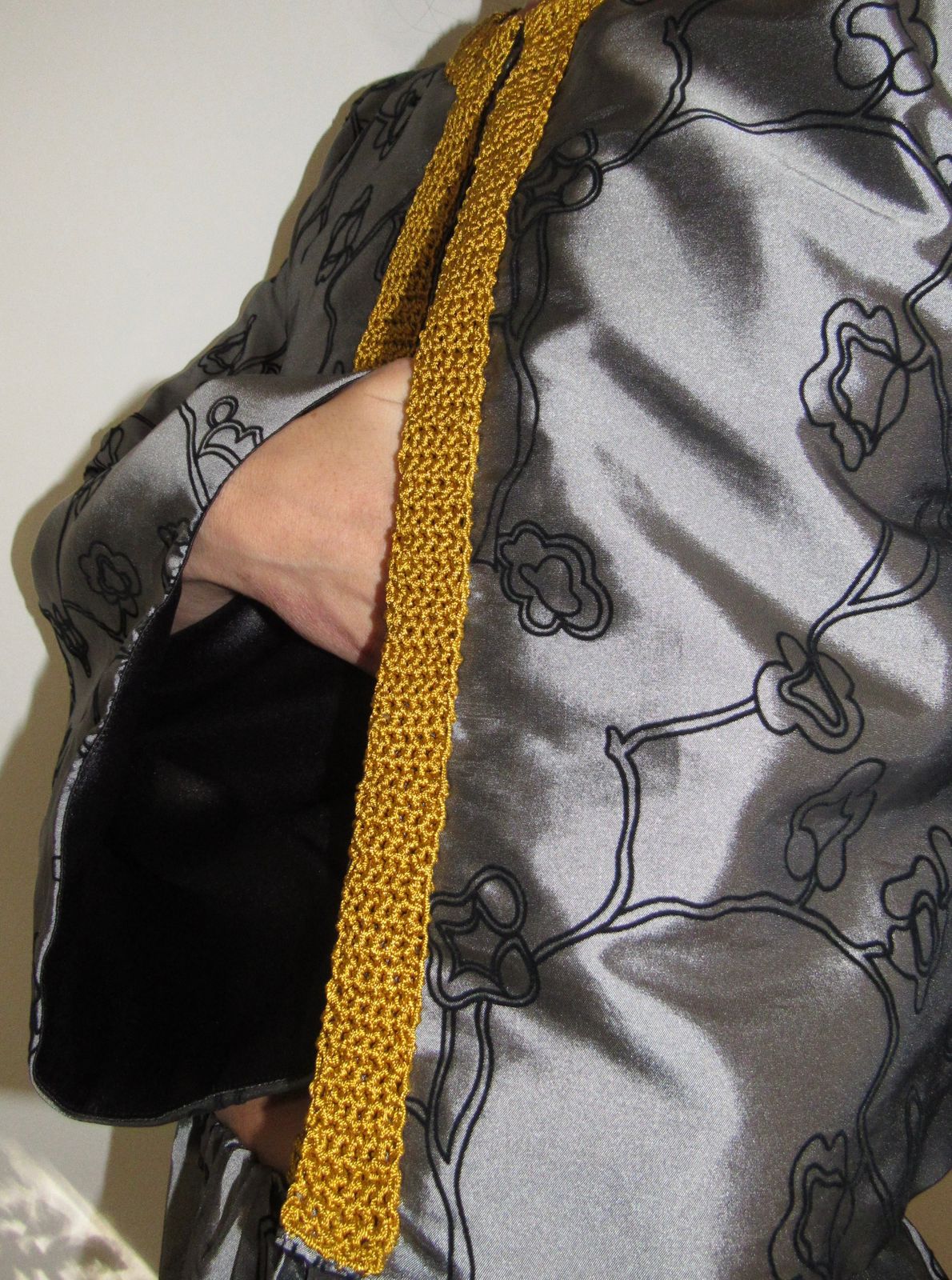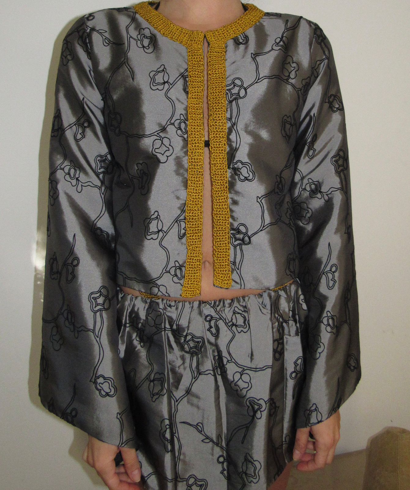 Casaco de tafeta bordado. Forrado em cetim com acabamentos em crochê amarelo. Tecido estampado.