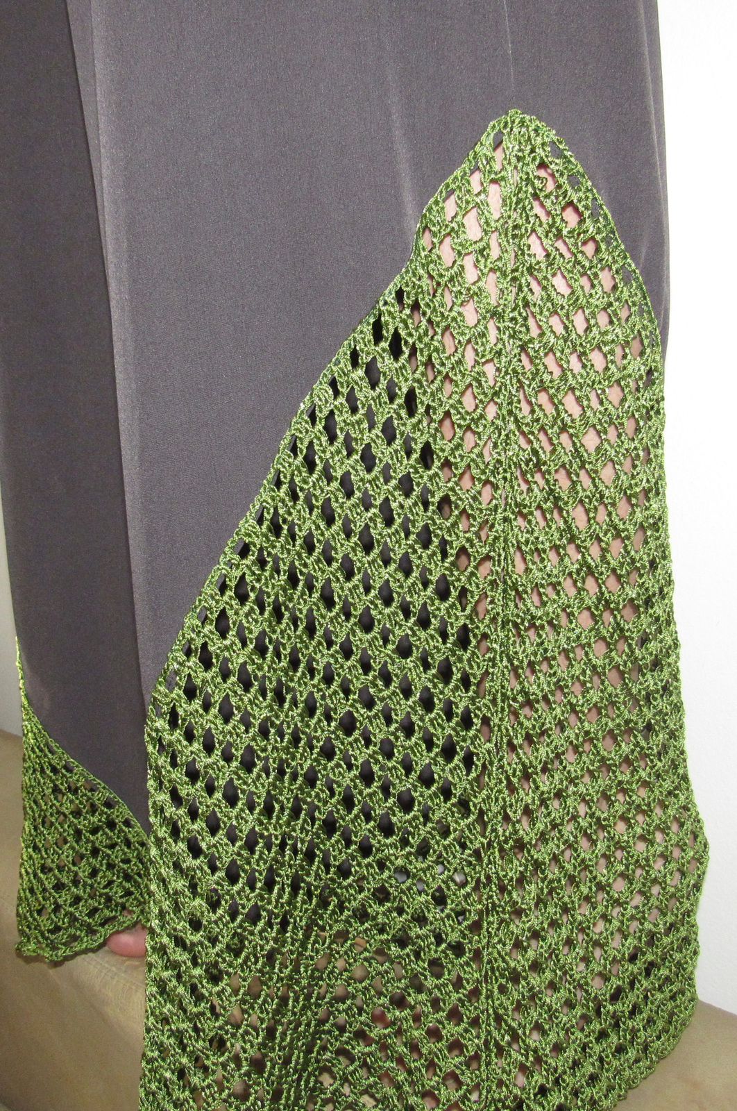 Calça pantalona com fenda em crochê. Crepe Chine grafite e crochê verde